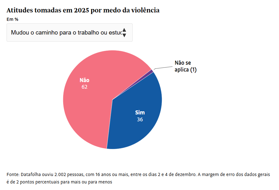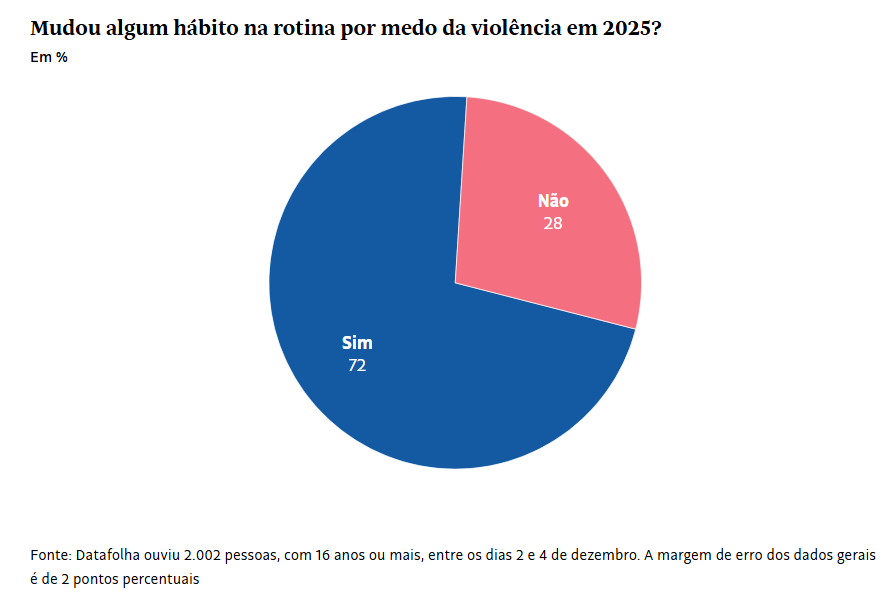 O medo da violência levou 72% dos brasileiros a mudar de alguma forma a rotina com a qual estavam habituados, mostra a mais recente pesquisa Datafolha sobre os impactos da violência e da segurança pública —ou da falta dela— na população.