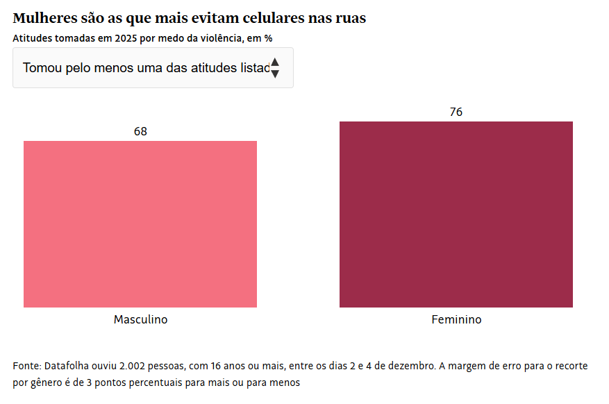 A mudança na rotina pelo medo da violência atinge 76% delas. No caso dos homens, 68%. No recorte por gênero, a margem de erro é de três pontos percentuais para mais ou para menos.