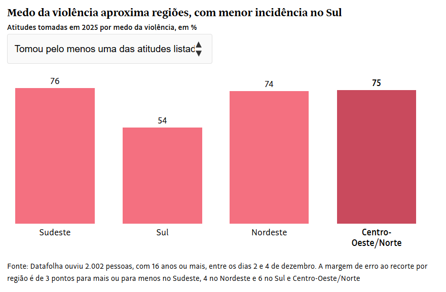 A mudança de hábitos é mais expressiva em regiões metropolitanas, onde 80% dos moradores relataram ter tomado alguma atitude devido ao medo da violência. No interior, a taxa foi de 66%.