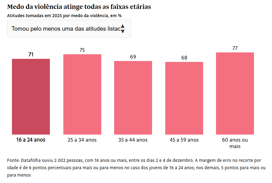 O medo da violência atinge todas as faixas etárias. Ela atinge mais de 65% em todos os grupos, sendo mais alta naqueles com 60 anos ou mais (77%).